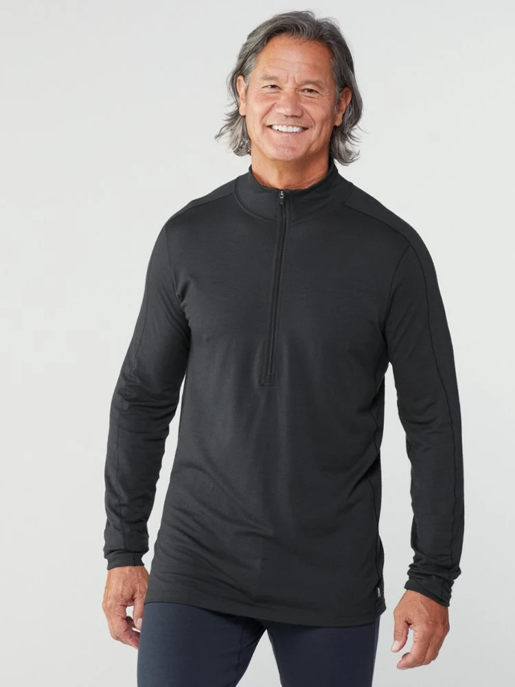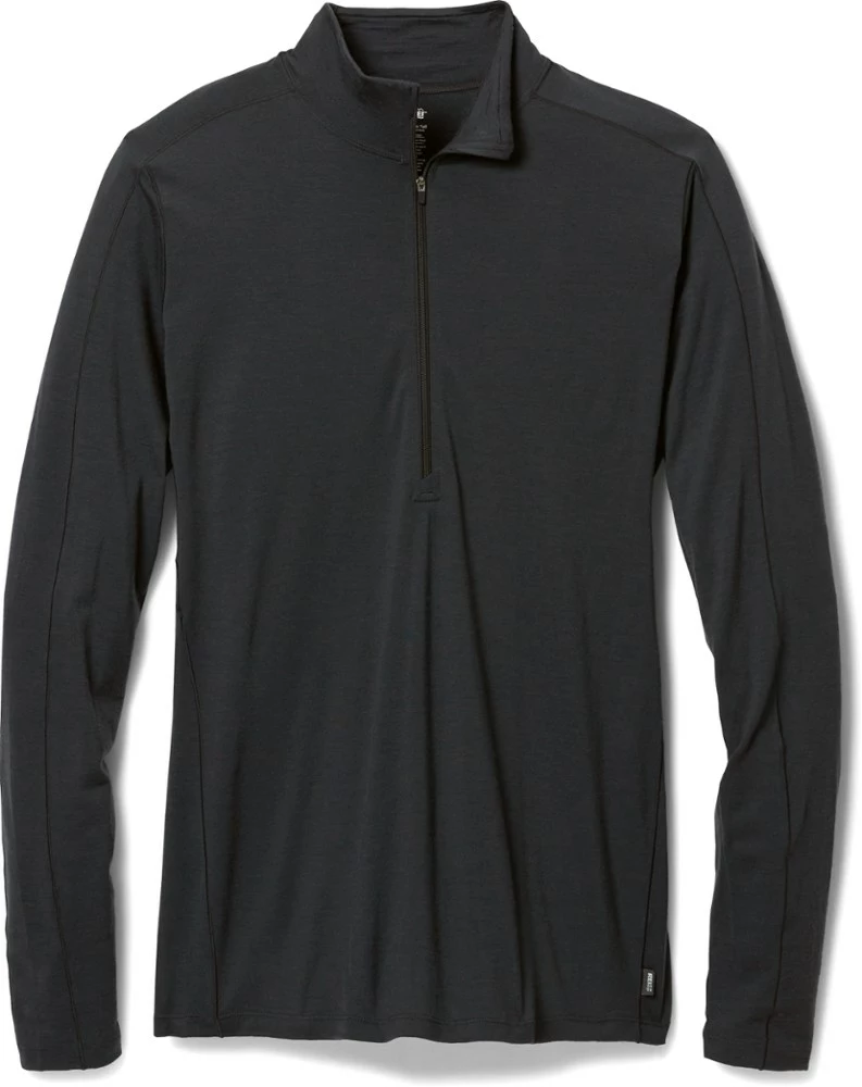 The ultrafine merino wool of the men’s REI Co-op Merino 185 long-sleeve half-zip base layer top is an ideal soft, breathable, odor-resistant layer for sweating on the trail—and sleeping in a tent.