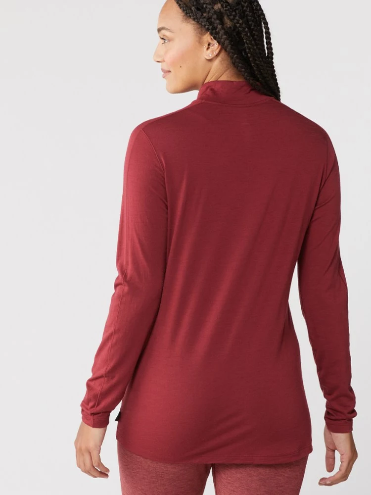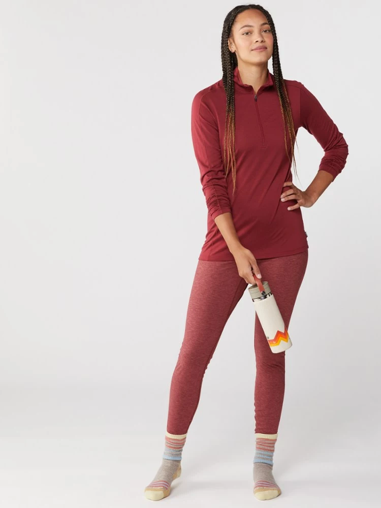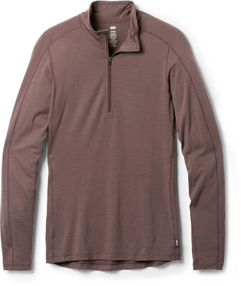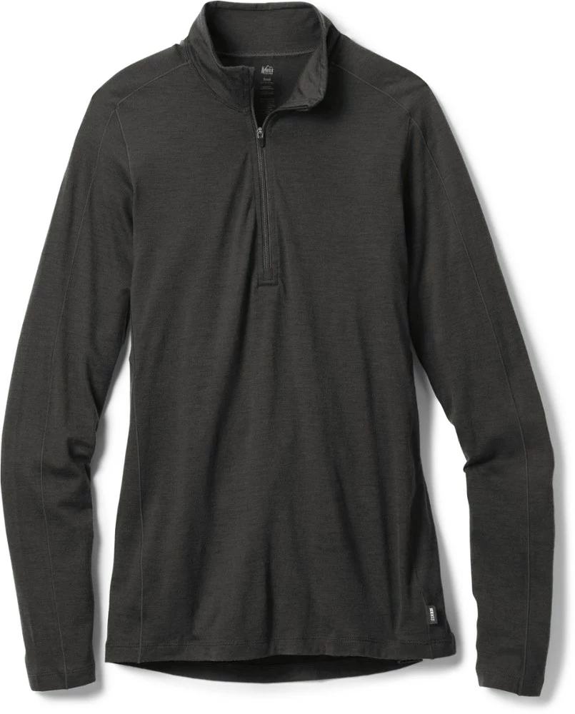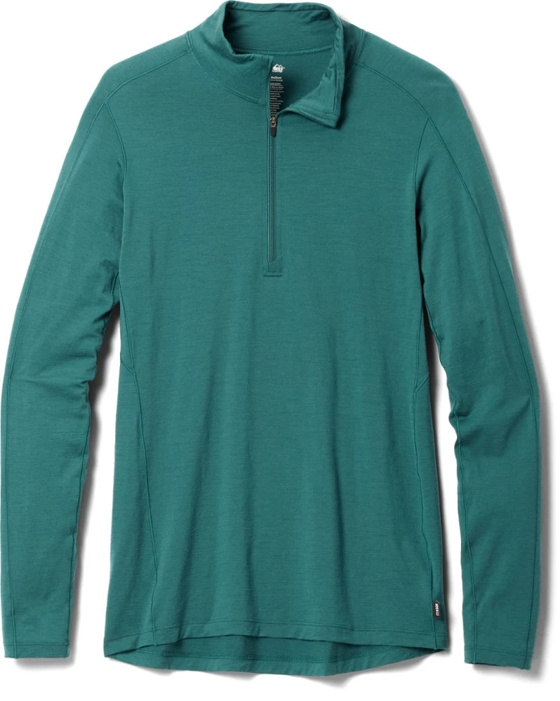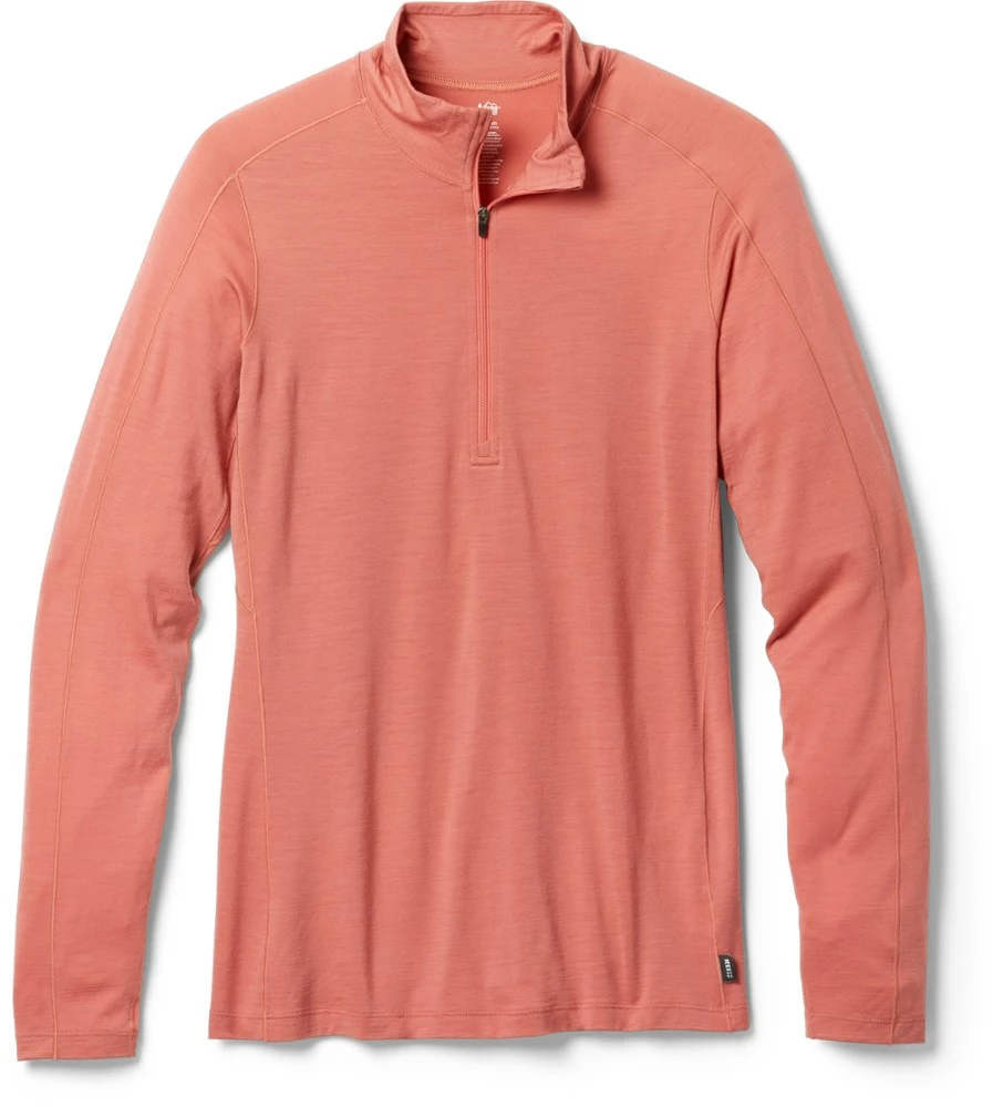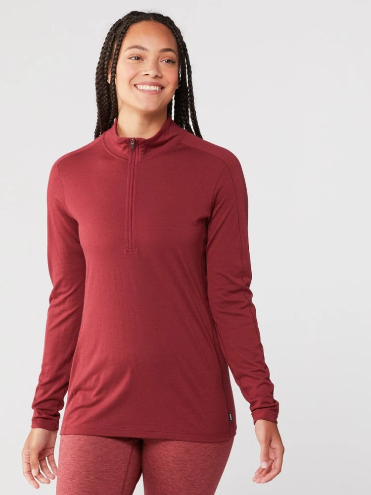 Naturally odor resistant, the ultrafine merino wool of the soft, breathable women’s REI Co-op Merino 185 long-sleeve half-zip base layer top is ideal for sweating on the trail—and sleeping in a tent.