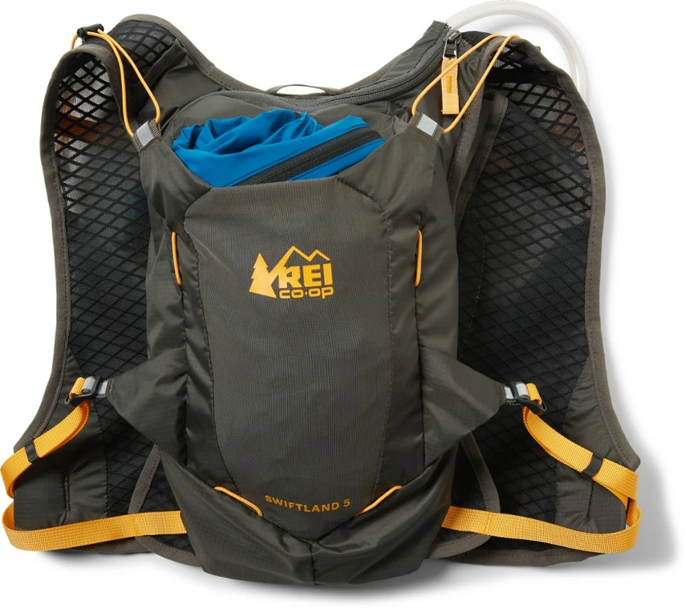 Tested for fit and performance on miles of trail runs, the men’s REI Co-op Swiftland 5 hydration pack has the compression, adjustability and storage to keep you comfortable all day out there.